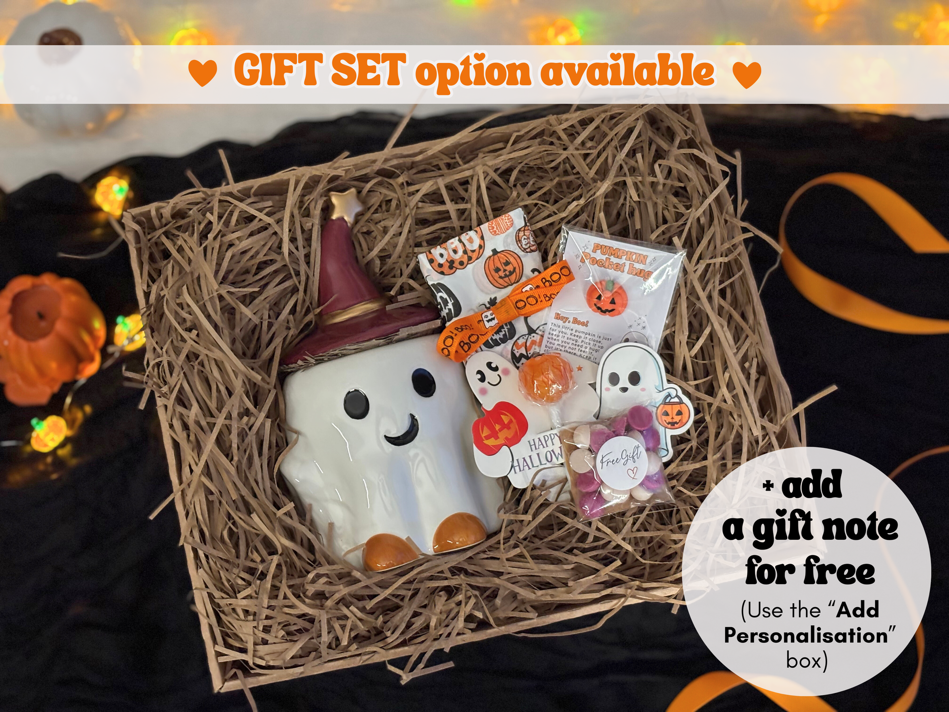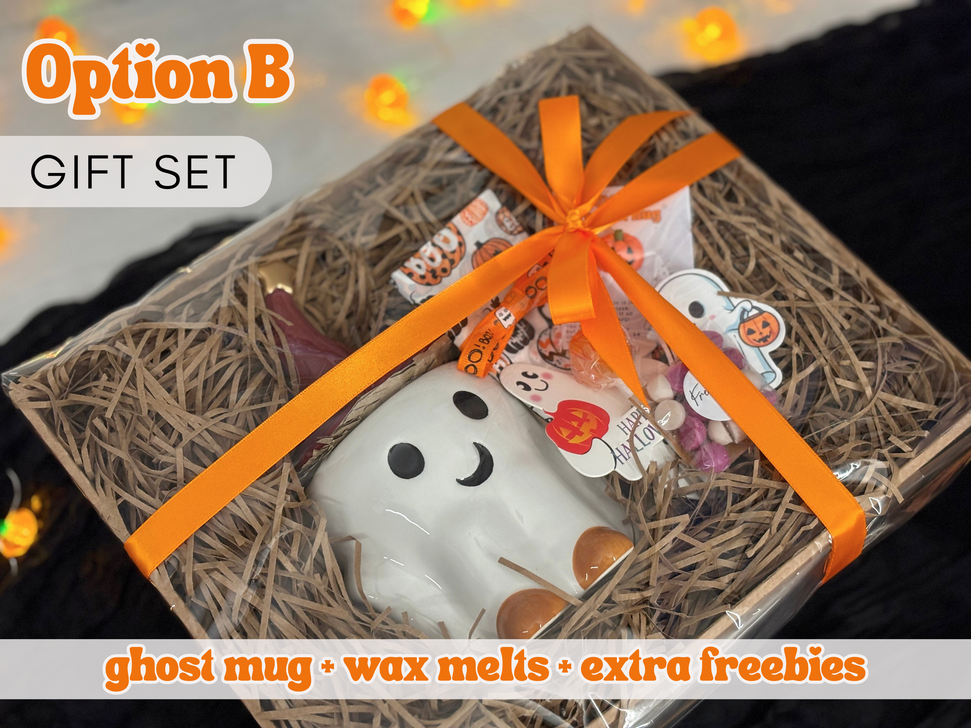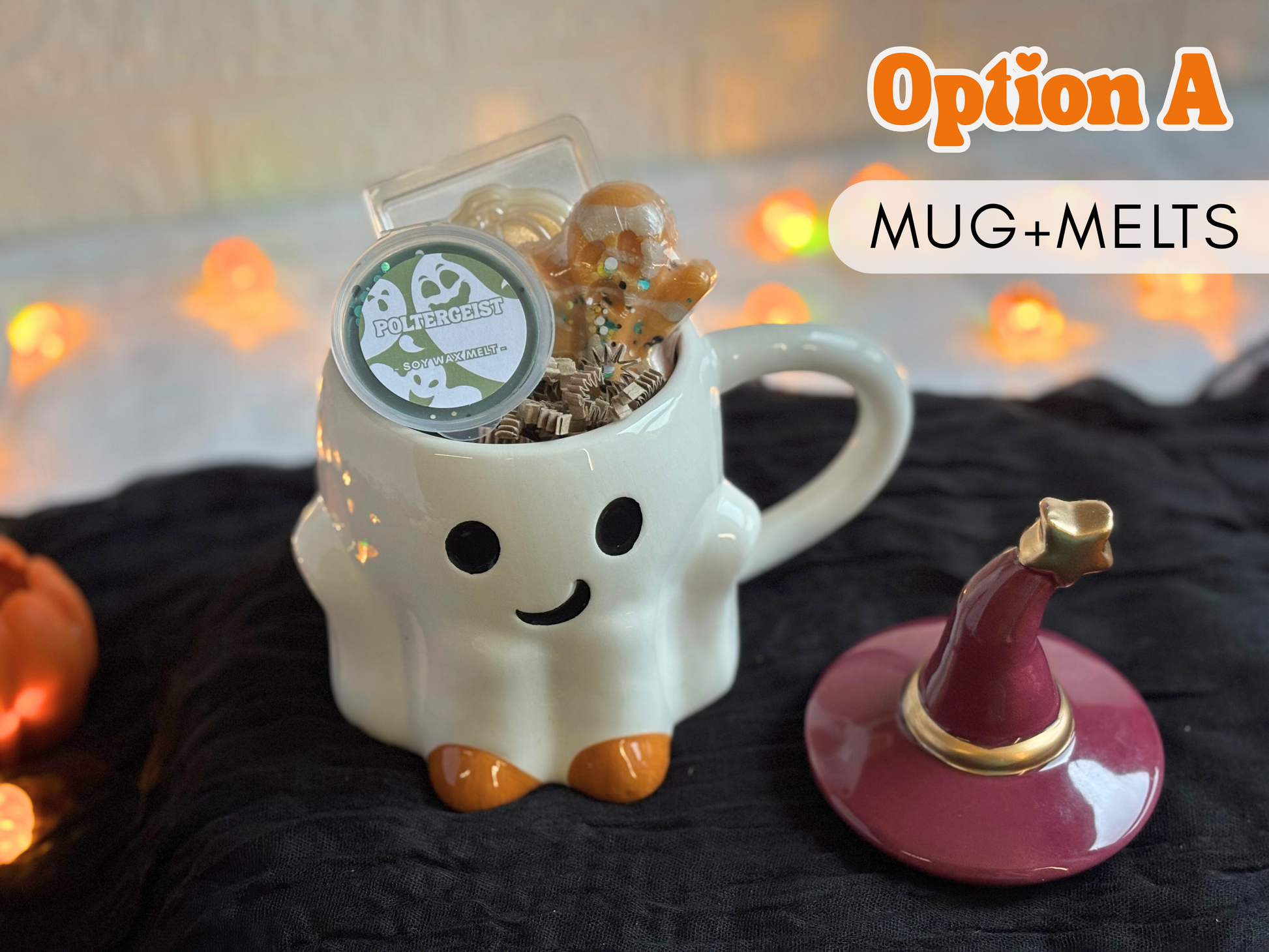 🎁 Choose Option B (Gift Set: mug, wax melts and some extra FREEBIES) to have this Halloween Mug Set beautifully presented in a kraft hamper with clear wrap, finished with an orange ribbon and bow — perfect for the Halloween vibes and an incredible gift for someone special! (No need to pay extra for gift wrap at checkout — just select the Gift Set option)