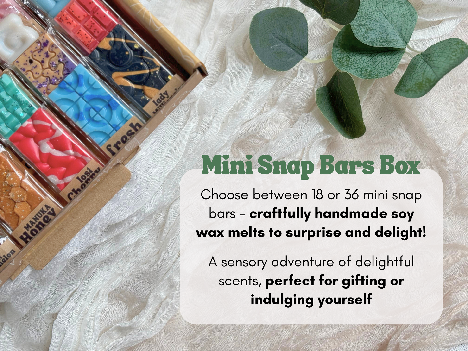 Bring warmth, joy, and a touch of surprise to your home with our Mini Snap Bars Mystery Box – a letterbox-friendly bundle of highly scented soy wax melts, lovingly hand-poured in small batches in the UK