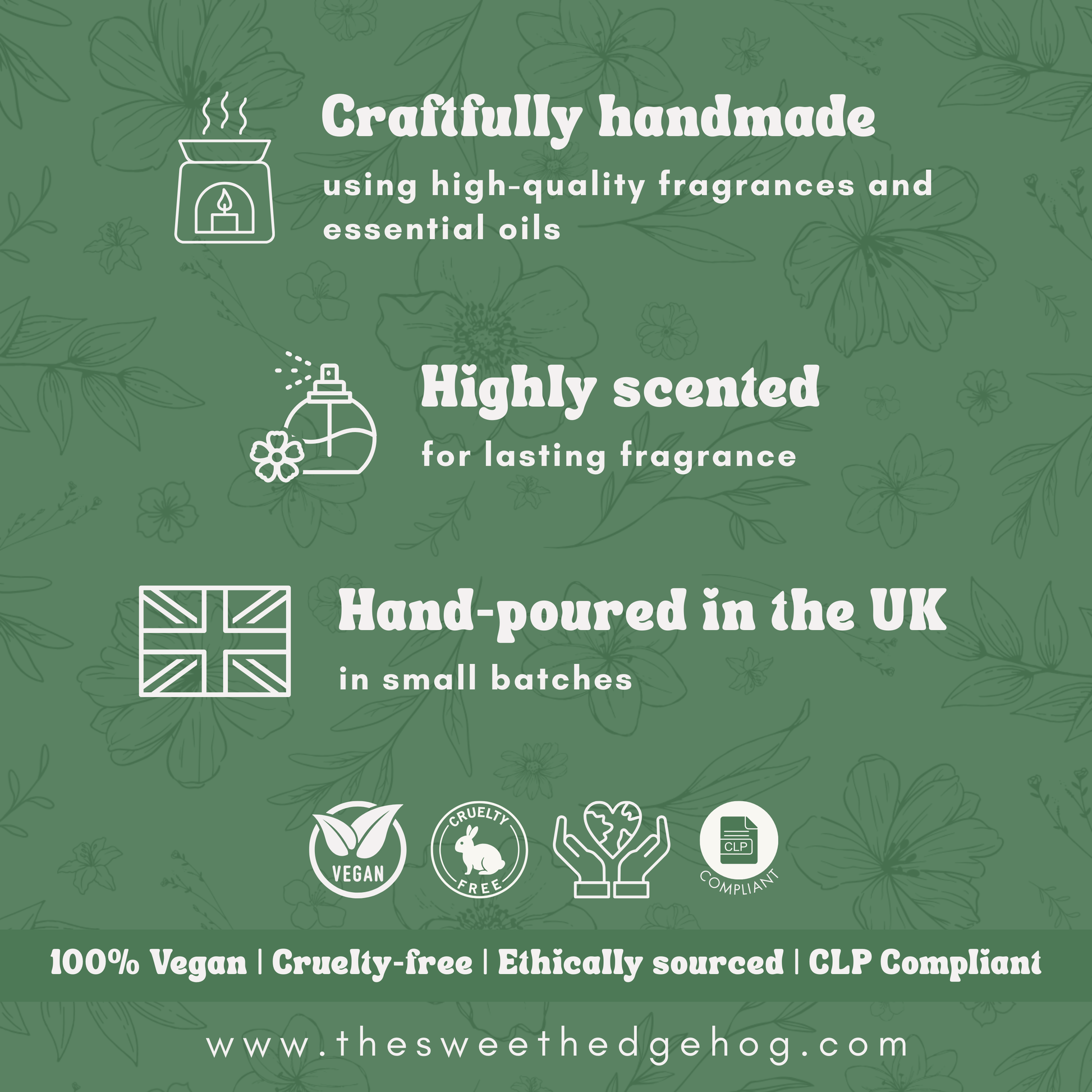 🌱 Kind & clean – Non-toxic, vegan-friendly, cruelty-free, and ethically sourced. Made in the UK with 100% pure soy wax